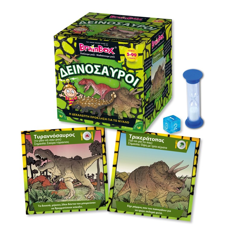 Ανακάλυψε τον κόσμο των δεινοσαύρων! Διάλεξε μία κάρτα μέσα από το BrainBox. Αναποδογύρισε την κλεψύδρα και προσπάθησε να τη μάθεις απ'έξω σε 10 δευτερόλεπτα! Τώρα ρίξε το ζάρι και απάντα στην αντίστοιχη ερώτηση. Αν απαντήσεις σωστά κρατάς την κάρτα, αν απαντήσεις λάθος βάζεις την κάρτα και πάλι μέσα στο BrainBox.