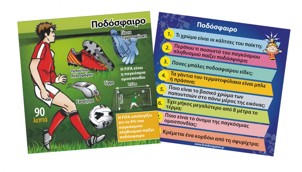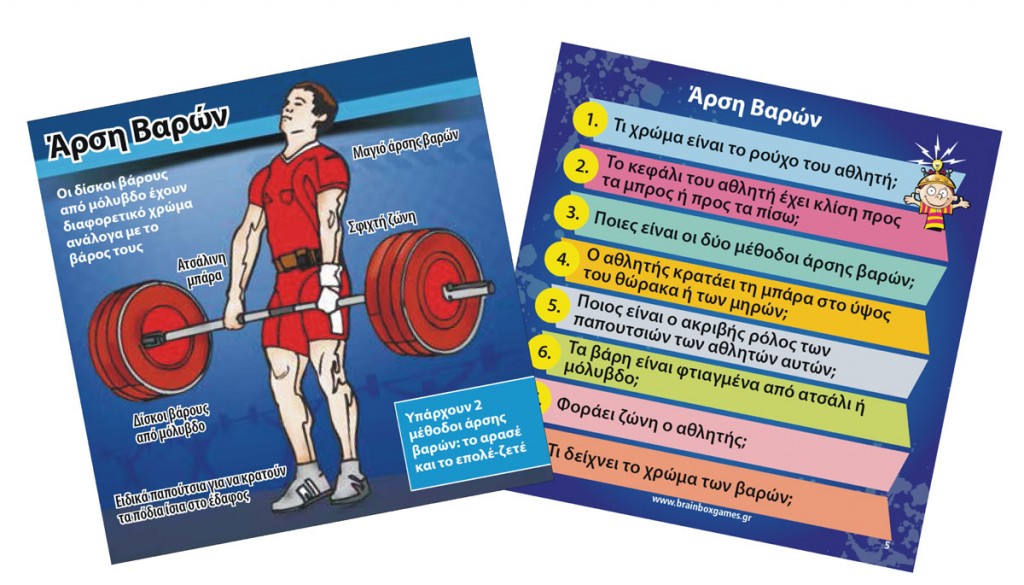 Σήκω απ'τη θέση σου, κάνε ζέσταμα...ώρα για παιχνίδι! Γνώρισε τα πιο δημοφιλή αθλήματα στον κόσμο. Διάλεξε μια κάρτα μέσα από το BrainBox. Αναποδογύρισε την κλεψύδρα και προσπάθησε να μάθεις απ'έξω την κάρτα σε 10 δευτερόλεπτα! Τώρα ρίξε το ζάρι και απάντησε στην αντίστοιχη ερώτηση. Αν απαντήσεις σωστά κρατάς την κάρτα, αν απαντήσεις λάθος βάζεις την κάρτα πάλι μέσα στο BrainBox.