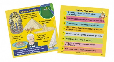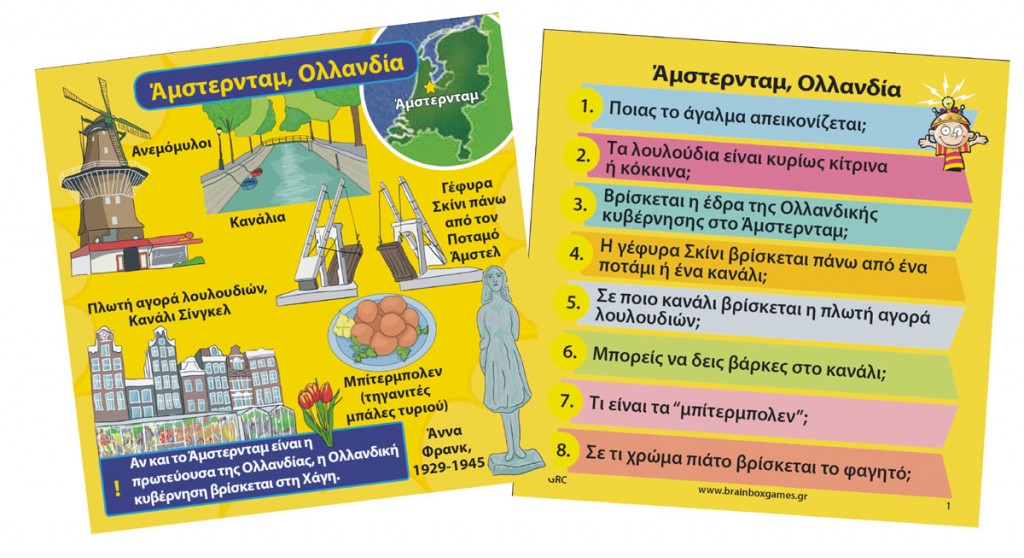 Ταξίδεψε στις πιο εντυπωσιακές πόλεις του κόσμου! Διάλεξε μια κάρτα μέσα από το BrainBox. Αναποδογύρισε την κλεψύδρα και προσπάθησε να μάθεις απ'έξω την κάρτα σε 10 δευτερόλεπτα! Τώρα ρίξε το ζάρι και απάντησε στην αντίστοιχη ερώτηση. Αν απαντήσεις σωστά κρατάς την κάρτα, αν απαντήσεις λάθος βάζεις την κάρτα πάλι μέσα στο BrainBox.