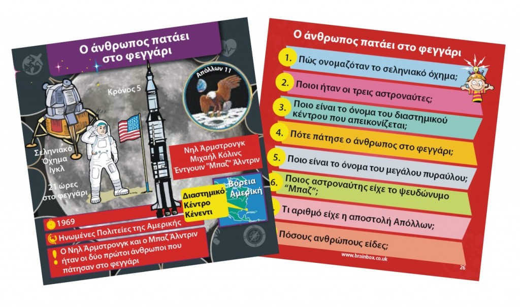 Μάθε για τα πιο συναρπαστικά γεγονότα της παγκόσμιας ιστορίας! Διάλεξε μια κάρτα μέσα από το BrainBox. Αναποδογύρισε την κλεψύδρα και προσπάθησε να μάθεις απ'έξω την κάρτα σε 10 δευτερόλεπτα! Τώρα ρίξε το ζάρι και απάντησε στην αντίστοιχη ερώτηση. Αν απαντήσεις σωστά κρατάς την κάρτα, αν απαντήσεις λάθος βάζεις την κάρτα πάλι μέσα στο BrainBox.