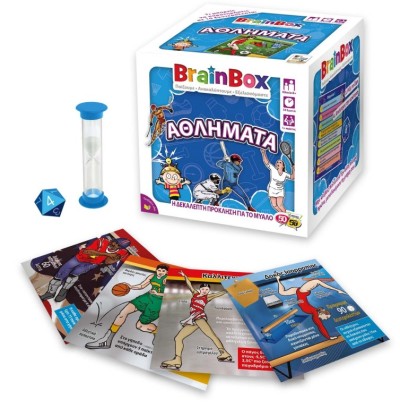 Σήκω απ'τη θέση σου, κάνε ζέσταμα...ώρα για παιχνίδι! Γνώρισε τα πιο δημοφιλή αθλήματα στον κόσμο. Διάλεξε μια κάρτα μέσα από το BrainBox. Αναποδογύρισε την κλεψύδρα και προσπάθησε να μάθεις απ'έξω την κάρτα σε 10 δευτερόλεπτα! Τώρα ρίξε το ζάρι και απάντησε στην αντίστοιχη ερώτηση. Αν απαντήσεις σωστά κρατάς την κάρτα, αν απαντήσεις λάθος βάζεις την κάρτα πάλι μέσα στο BrainBox.