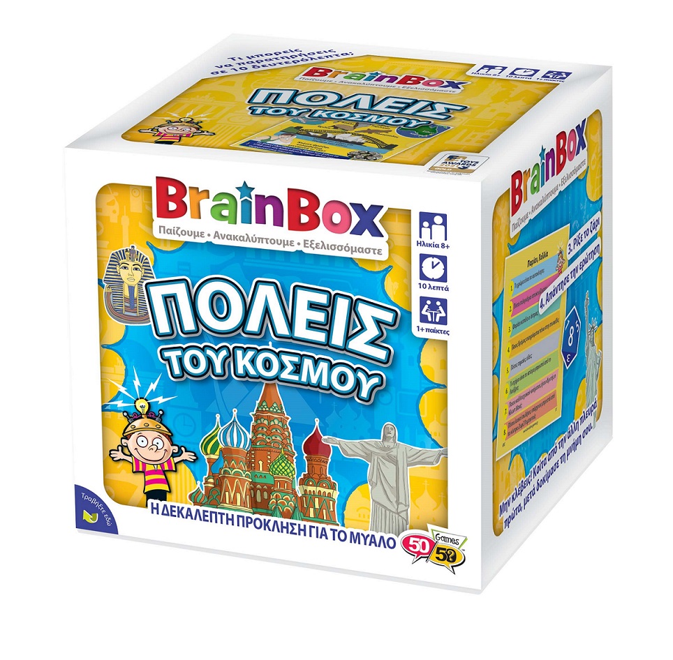 Ταξίδεψε στις πιο εντυπωσιακές πόλεις του κόσμου! Διάλεξε μια κάρτα μέσα από το BrainBox. Αναποδογύρισε την κλεψύδρα και προσπάθησε να μάθεις απ'έξω την κάρτα σε 10 δευτερόλεπτα! Τώρα ρίξε το ζάρι και απάντησε στην αντίστοιχη ερώτηση. Αν απαντήσεις σωστά κρατάς την κάρτα, αν απαντήσεις λάθος βάζεις την κάρτα πάλι μέσα στο BrainBox.