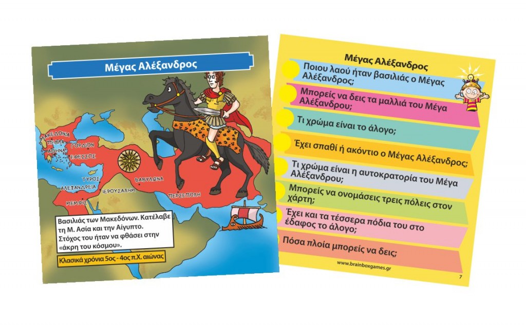 Αυτό το συναρπαστικό BrainBox βελτιώνει την παρατηρητικότητα και τις μνημονικές ικανότητες των παιδιών ενώ παράλληλα ταξιδεύει πίσω στον χρόνο παρουσιάζοντας κάποια από τα πιο σημαντικά ιστορικά γεγονότα της Ελλάδας. Κάθε κάρτα έχει εικόνες με ιστορικές μάχες, μνημεία, σπουδαία πρόσωπα και πολλές ακόμη διασκεδαστικές πληροφορίες! Διάλεξε μια κάρτα μέσα από το BrainBox. Αναποδογύρισε την κλεψύδρα και προσπάθησε να μάθεις απέξω την κάρτα σε 10 δευτερόλεπτα! Τώρα ρίξε το ζάρι και απάντησε στην αντίστοιχη ερώτηση. Αν απαντήσεις σωστά κρατάς την κάρτα, αν απαντήσεις λάθος βάζεις την κάρτα πάλι μέσα στο BrainBox. Σκοπός του παιχνιδιού: Μάζεψε τις περισσότερες κάρτες μέσα σε 10 λεπτά.
