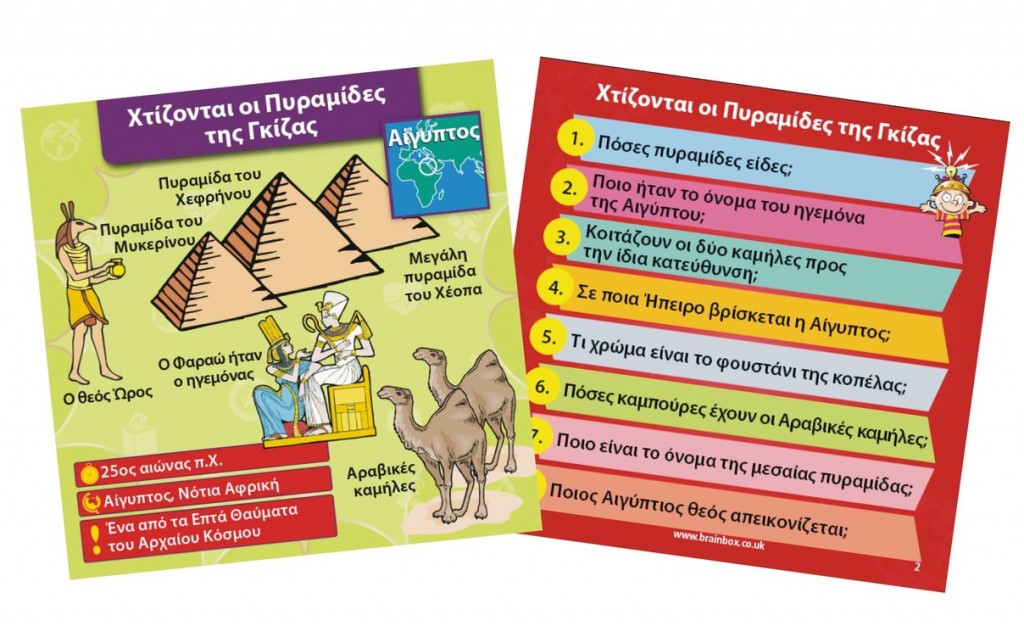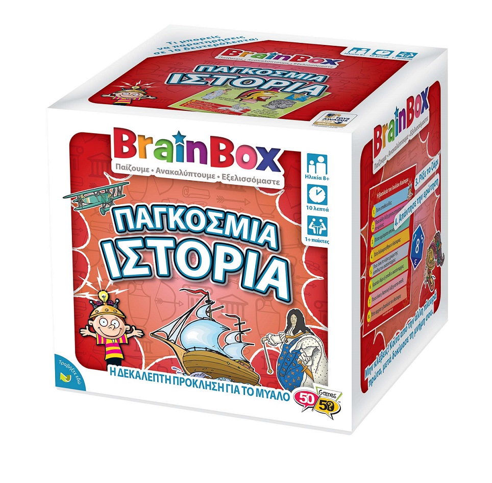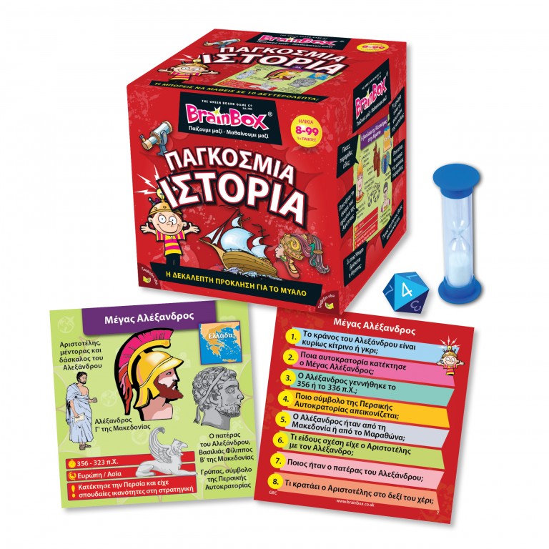 Μάθε για τα πιο συναρπαστικά γεγονότα της παγκόσμιας ιστορίας! Διάλεξε μια κάρτα μέσα από το BrainBox. Αναποδογύρισε την κλεψύδρα και προσπάθησε να μάθεις απ'έξω την κάρτα σε 10 δευτερόλεπτα! Τώρα ρίξε το ζάρι και απάντησε στην αντίστοιχη ερώτηση. Αν απαντήσεις σωστά κρατάς την κάρτα, αν απαντήσεις λάθος βάζεις την κάρτα πάλι μέσα στο BrainBox.